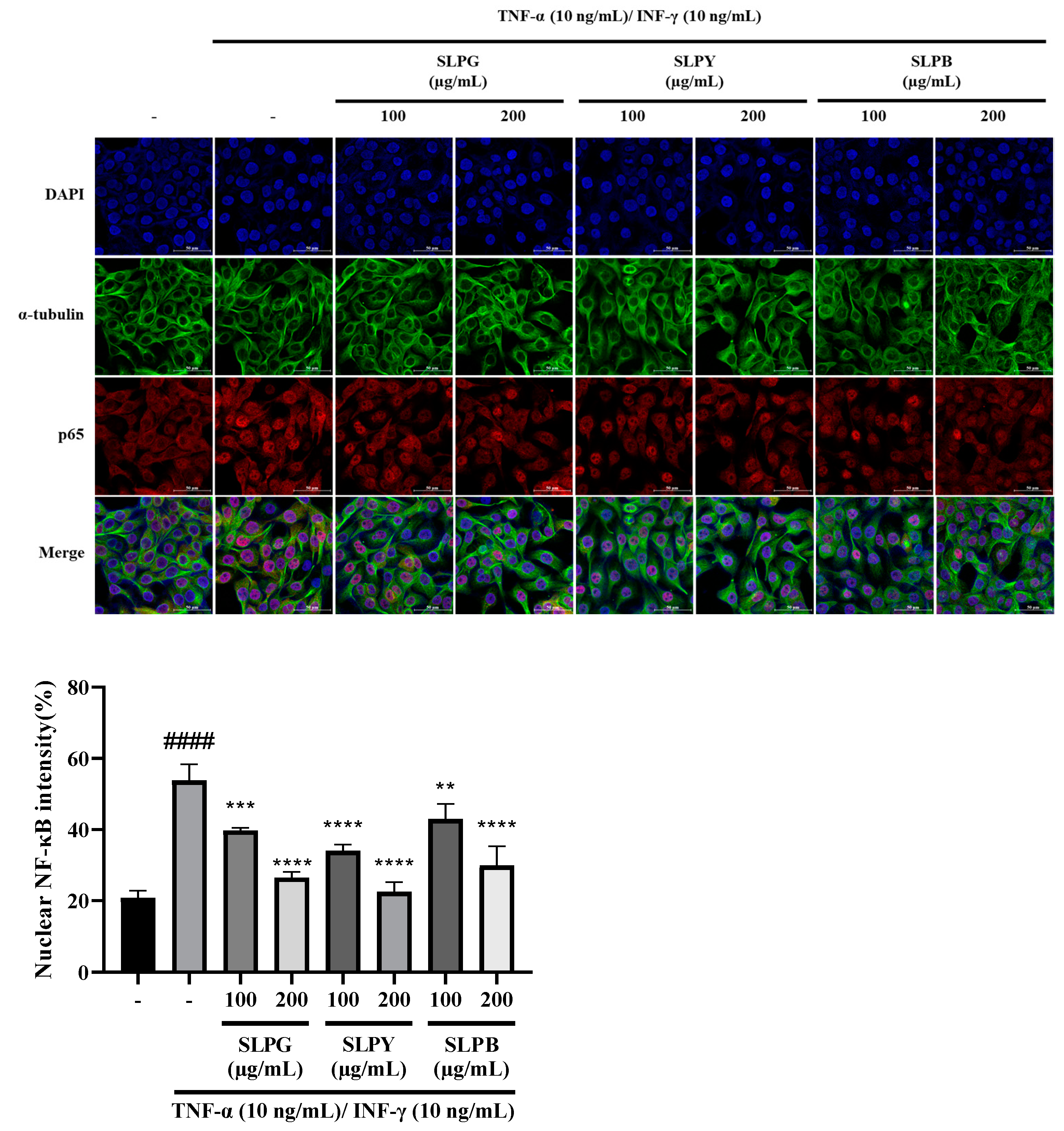 3.3. Powdered by-Products of Silkworm Larvae Attenuate NF-kB p65 Nuclear Translocation in Stimulated HaCaT Cells