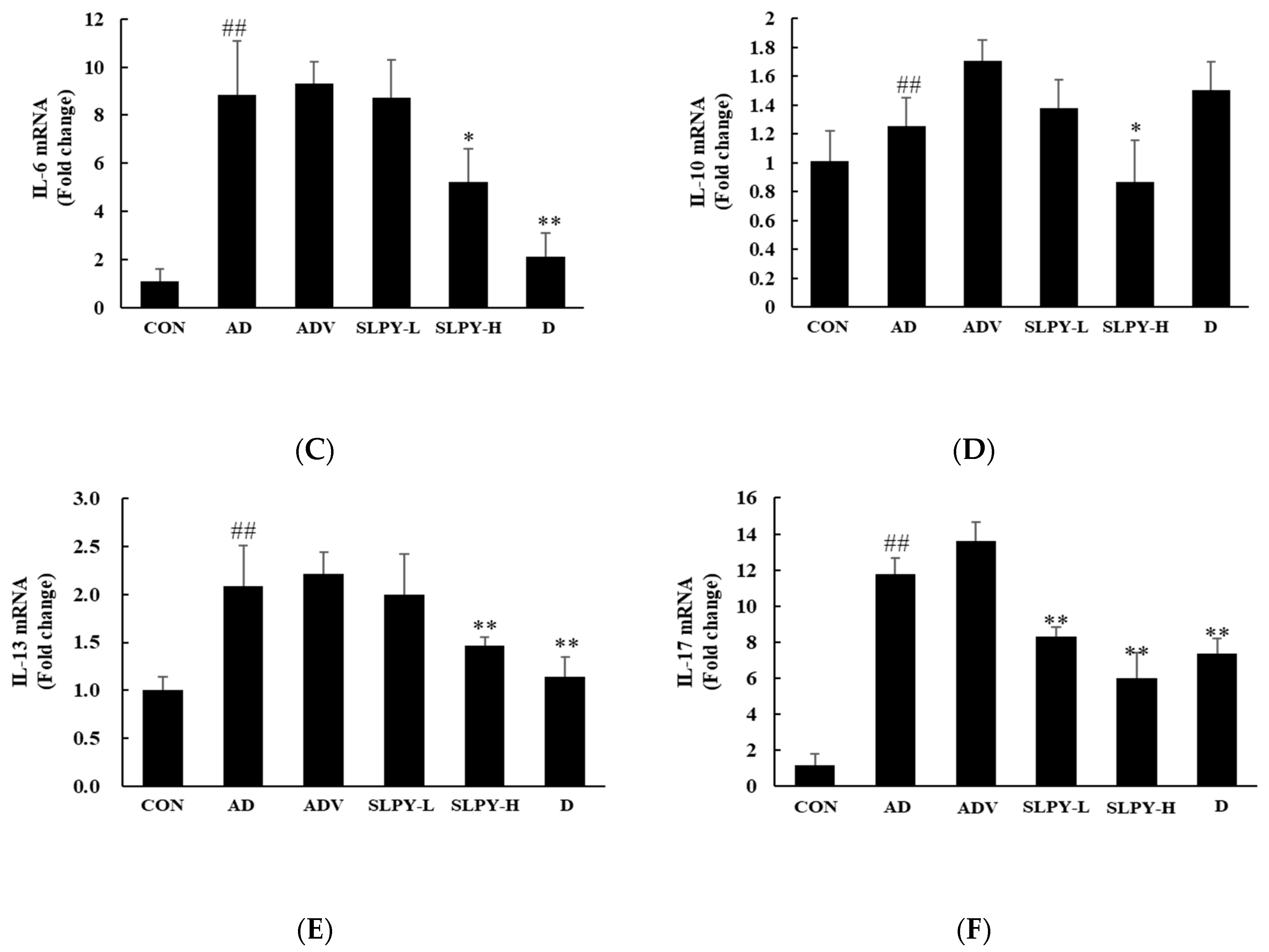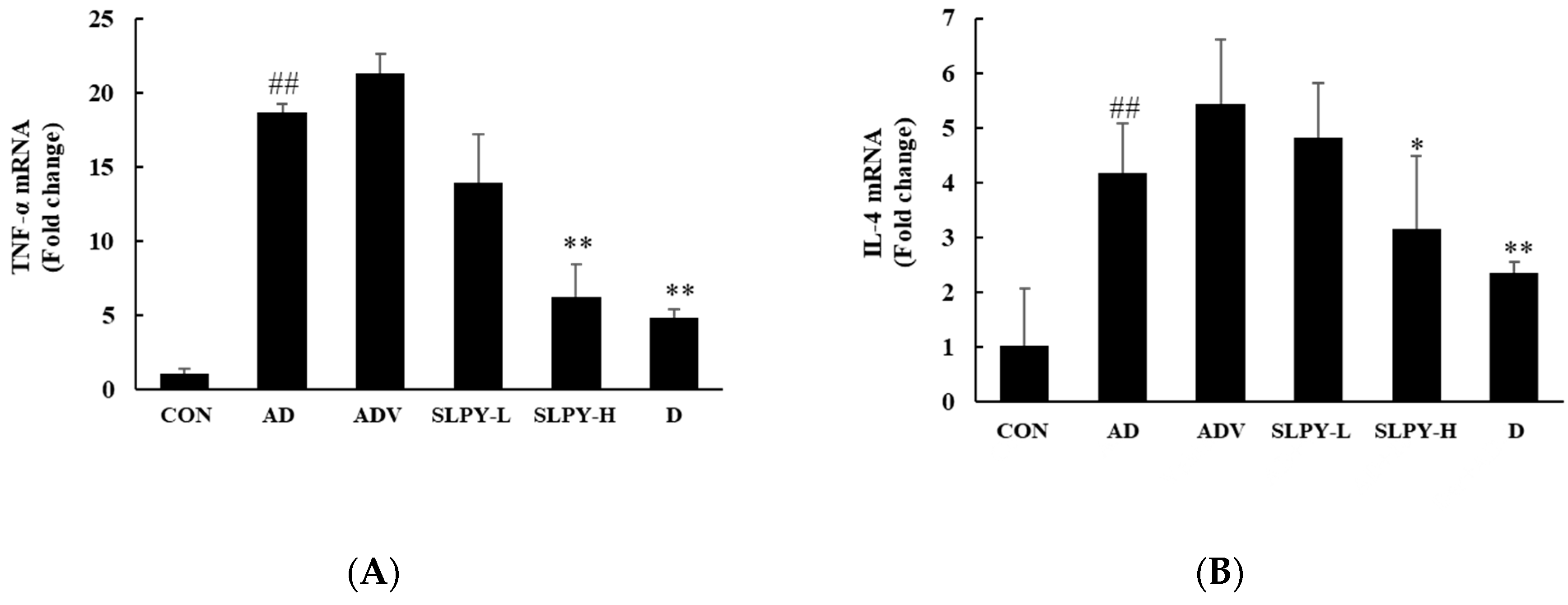 3.7. SLPY Inhibits the Expression Levels of Inflammatory Cytokines in DNCB-Induced Mice