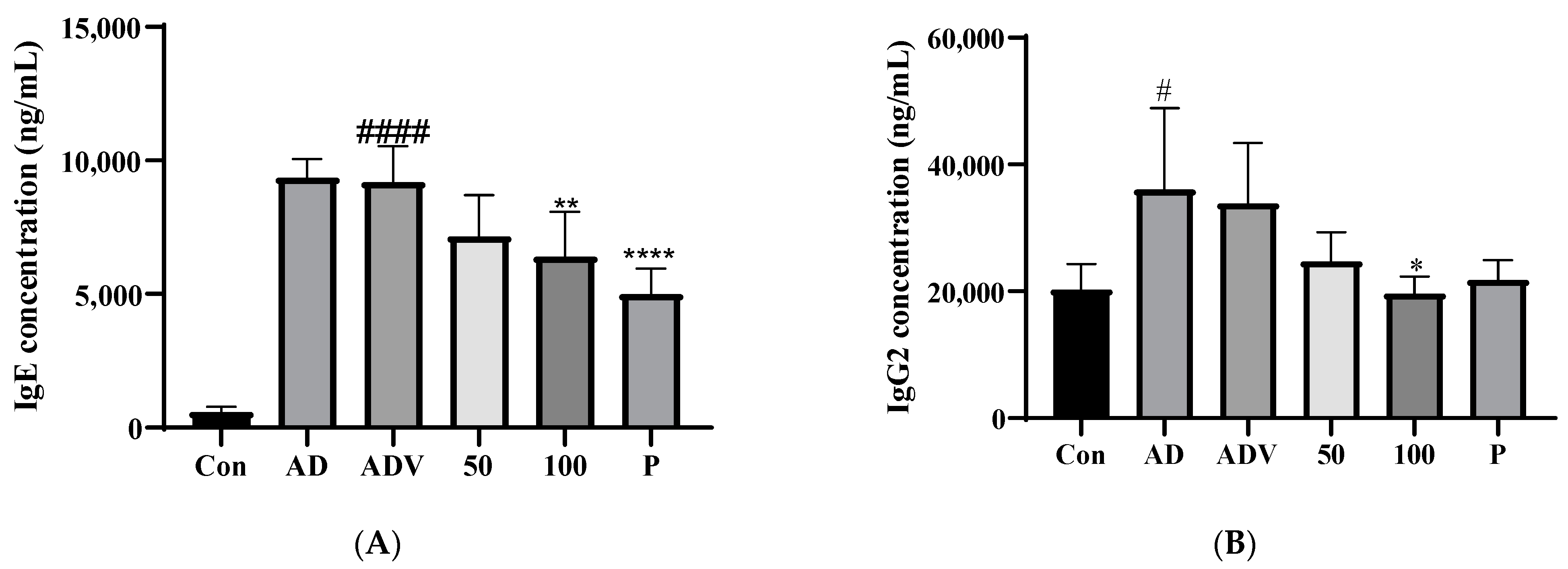 2.11. Serum Immunoglobulin Analysis of DNCB-Induced AD Mice