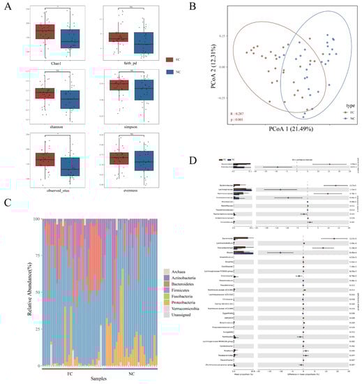 Several indexes were used to compare the α-diversities of FC and NC. The Chao1 index and observed OTUs of the FC group were higher, but the Shannon index, evenness index, Simpson index, and faith pd index of the two groups showed no significant difference (Figure 1A). Such results indicated that microbiota richness was higher in FC and that the microbiota evenness of the two groups had no difference.