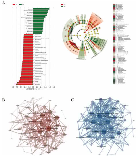 (A) LEfSe analysis for key genera selection. LDA score plot shows the differential genera. Higher LDA scores represent greater contribution of bacterial genera to the differences. Cladogram demonstrates differences at different levels. (B,C) Gut microbial network of the FC group and the NC group. The darker the dot’s color and larger the its size, the more related genera this genus has. A thicker line represents a stronger correlation.
