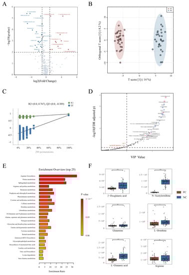 Serum metabolite structures. (A) Volcano plot shows differential metabolites with fold change > 1 and p < 0.01 between the two groups. The red points represent higher metabolite content in the FC group, while the blue points represent lower content. (B) OPLS-DA shows the differences in metabolites. The abscissa reflects the differences between the two groups, and the ordinate reflects the differences among samples within groups. (C) Permutation test based on OPLS-DA for validating the model’s reliability. (D) Point plot of VIP value and p-value. Red points represent higher metabolite content in the FC group, and blue points represent lower content. (E) Pathway enrichment bar plot. (F) Content of metabolites related to arginine biosynthesis pathway in the two groups. * p < 0.05, *** p < 0.001, NS p ≥ 0.05.