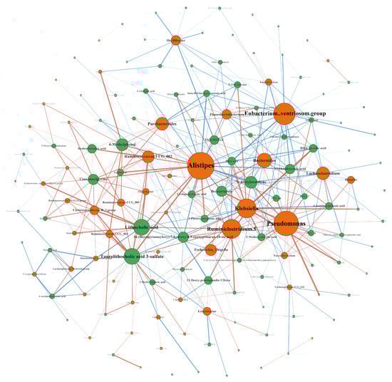 Correlation network of microbiome and metabolome. Correlation is represented by the connecting lines. A red connecting line represents a positive correlation between nodes, and a blue line represents a negative correlation. The size of a node is proportional to the number of lines it is connected to.