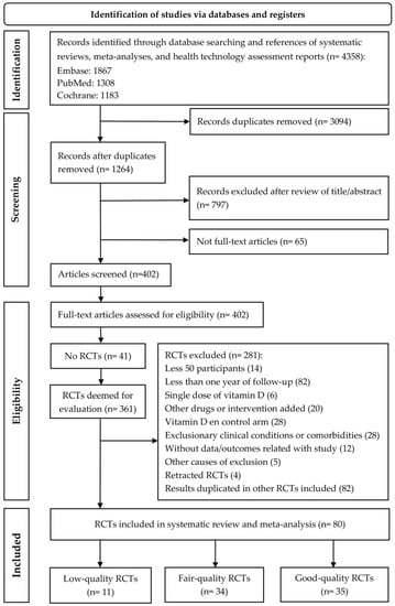 The initial literature search yielded 4358 articles. After selecting titles and abstracts according to the inclusion and exclusion criteria, 361 RCTs were deemed suitable for evaluation, and 3997 were excluded. Following their full-text assessment, 281 RCTs were not included in the meta-analysis for the following exclusion reasons: 14 RCTs with fewer than 50 participants; 82 RCTs with less than one year of follow-up; 6 RCTs that included a single dose of vitamin D; 20 RCTs that assessed other drugs or added an intervention in either arm; 28 RCTs that included vitamin D in the control arm; 28 RCTs that included study subjects suffering from exclusionary clinical conditions or comorbidities; 12 RCTs without data/outcomes related to this review; 5 RCTs with other causes for exclusion (2 RCTs not written in English; 1 RCT with child participants; 2 RCTs with other formulations of vitamin D or non-oral route of administration), 4 retracted RCTs; and 82 RCTs whose results were duplicated in other RCTs included in the present study. The PRISMA flowchart of the search and selection of RCTs is shown in Figure 1. Therefore, 80 RCTs [,,,,,,,,,,,,,,,,,,,,,,,,,,,,,,,,,,,,,,,,,,,,,,,,,,,,,,,,,,,,,,,,,,,,,,,,,,,,,,,] were included in the present meta-analysis, of which 35 [,,,,,,,,,,,,,,,,,,,,,,,,,,,,,,,,,,] were at low risk of bias, 34 [,,,,,,,,,,,,,,,,,,,,,,,,,,,,,,,,,] were at fair risk of bias, and 11 [,,,,,,,,,,] were at high risk of bias.