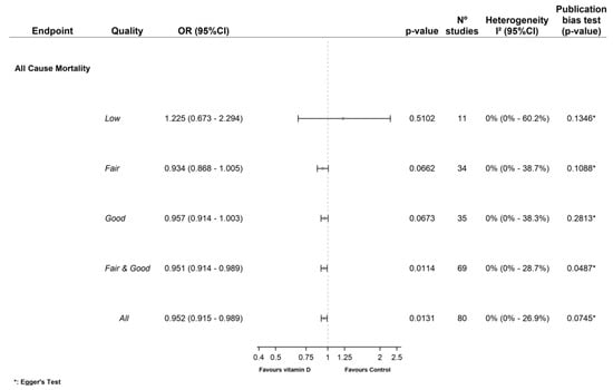 Meta-analysis of all the RCTs [,,,,,,,,,,,,,,,,,,,,,,,,,,,,,,,,,,,,,,,,,,,,,,,,,,,,,,,,,,,,,,,,,,,,,,,,,,,,,,,] showed that vitamin D supplementation reduced the ACM risk (OR 0.95 [95%CI 0.93 to 0.99], (p = 0.013), I2 = 0%). Subgroup analysis of the fair- and good-quality RCTs [,,,,,,,,,,,,,,,,,,,,,,,,,,,,,,,,,,] showed that the pooled effect of vitamin D supplementation also decreased the ACM risk (OR 0.95 [95%CI 0.91 to 0.99], (p = 0.011) I2 = 0%). However, this effect bordered on statistical significance when the fair-quality RCTS [,,,,,,,,,,,,,,,,,,,,,,,,,,,,,,,,,] (OR 0.93 [95%CI 0.87 to 1.00], (p = 0.066) I2 = 0%) or the good-quality RCTs [,,,,,,,,,,,,,,,,,,,,,,,,,,,,,,,,,,] (OR 0.96 [95%CI 0.91 to 1.00], (p = 0.067) I2 = 0%) were analyzed separately. Vitamin D supplementation was not associated with a lower ACM risk if only the low-quality RCTs [,,,,,,,,,,] were analyzed (OR 1.22 [95%CI 0.67 to 2.29], (p = 0.510) I2 = 0%) (Figure 2).