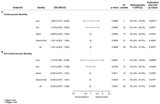 The pooled effect of vitamin D supplementation in reducing the risk of non-CVM was close to statistical significance in the analysis of all the RCTs (OR 0.94 [95%CI 0.88 to 1.00], (p = 0.055), I2 = 0%) when analyzing the fair- and good-quality RCTs [,,,,,,,,,,,,,,,,,,,,,,,,,,,,,,,] (OR 0.94 [95%CI 0.87 to 1.00], (p = 0.053), I2 = 0%), and when analyzing only the good-quality RCTs [,,,,,,,,,,,,,,,,,,] (OR 0.93 [95%CI 0.87 to 1.00], (p = 0.051), I2 = 0%). Subgroup analysis showed no significant differences between the comparison groups in the low-quality RCTs [,,,,,,] (OR 1.06 [95%CI 0.37 to 3.05] (OR 1.15 [95%CI 0.26 to 5.55], (p = 0.847) I2 = 0%), and the fair-quality RCTs [,,,,,,,,,,,,] (OR 1.01 [95%CI 0.57 to 1.78], (p = 0.974) I2 = 0%) (Figure 3B).