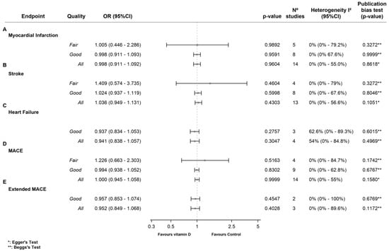 Meta-analysis of all the RCTs showed no association between vitamin D supplementation and lower MACE risk (OR 1.00 [95%CI 0.95 to 1.06], (p = 1.00), I2 = 42.5%). Subgroup analysis showed no significant differences between the comparison groups in the fair-quality RCTs [,,,] (OR 1.23 [95%CI 0.66 to 2.30], (p = 0.516) I2 = 0%) or the good-quality RCTs [,,,,,,,,] (OR 0.99 [95%CI, 0.94 to 1.05], (p = 0.830) I2 = 0%) (Figure 4D).