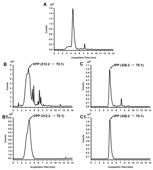 LC-MS/MS chromatogram of VPP and IPP in CH. (A) TIC of CH; (B) Chromatogram of VPP in CH in positive MRM mode, and the retention time (RT) of VPP is 3.500 min; (B1) Standard chromatogram (SC) of VPP in positive MRM mode; (C) Chromatogram of IPP in CH in positive MRM mode, and the RT of IPP is 4.968 min; (C1) SC of IPP in positive MRM mode.