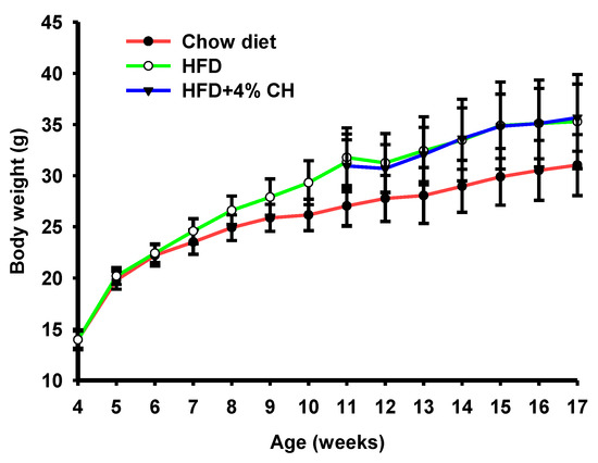 The effects of CH supplementation on the body weight change of obese mice induced by HFD.