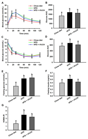 The effects of CH supplementation on the blood glucose tolerance and insulin tolerance of mice fed with HFD. The curve of blood glucose level at different time intervals in OGTT assay (A) and the AUC value of blood glucose curve in OGTT assay (B), the curve of blood glucose level at different time intervals in IPITT assay (C) and the AUC value of blood glucose curve in IPITT assay (D), fasting glucose level (E), fasting insulin level (F) and HOMA-IR (G), all values were exhibited as means ± SD (n = 12). Different letters indicated statistically significant difference at p < 0.05.
