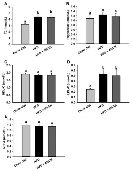 The plasma lipid metabolism profile was further investigated after animal experiments. Compared with the Chow diet group, HFD consumption induced significant increased TC and LDL-C levels in obese mice as shown in Figure 4A,D. Supplementation with 4% CH didn’t reverse this increase. At the same time, no significant differences were observed in triglyceride, HDL-C and NEFA levels among each treatment group (Figure 4A,C,E). These data indicated that lipid metabolism was not affected by CH supplementation.