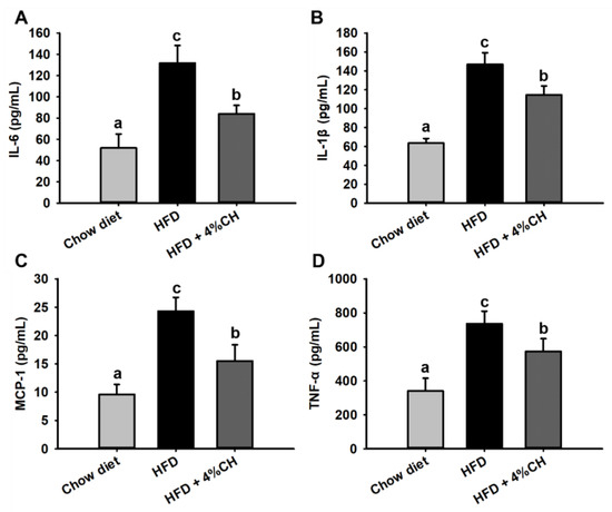 The effects of CH supplementation on the serum inflammatory factors in HFD-induced obese mice. The level of IL-6 (A), IL-1β (B), MCP-1 (C) and TNF-α (D) in the serum of mice. All data were shown as means ± SD (n = 12). Data sharing the different superscript letters in each column indicated that the difference between each group was statistically significant at p < 0.05.