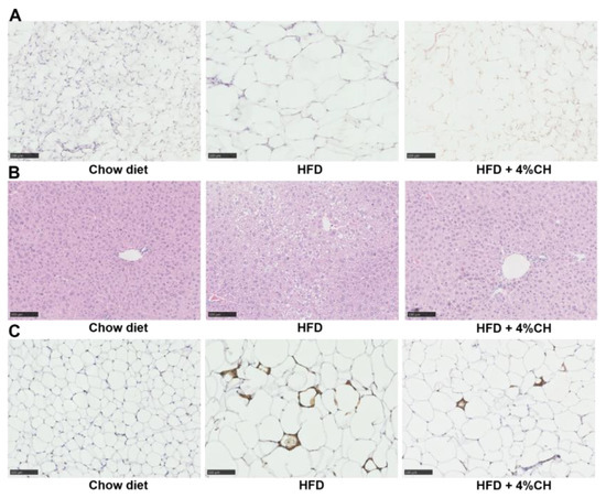 The effects of CH consumption on the histological change of epididymal adipose and liver tissue. Representative sections of epididymal white adipose tissue (A) and liver (B) stained with HE. Representative adipose tissue sections immunostained with F4/80 primary antibody (C). All images were presented at 100× magnification.