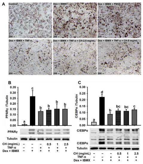CH alleviated impaired adipocyte differentiation induced by TNF-α. 3T3-L1 were incubated in a differentiation medium containing 2.5 mg/mL and 5 mg/mL CH for 1 h, followed by the treatment of 10 ng/mL TNF-α for 24 h, and then refreshed with a new differentiation medium with or without CH after 48 h and 72 h, respectively. Oil red O staining was used to detect the accumulation of lipid droplets during cell differentiation (A). 3T3-L1 cells were seeded in 6-well plates, and incubated in differentiation medium containing 0.5, 1 and 2.5 mg/mL CH for 1 h, respectively. Then 10 ng/mL TNF-α was added and incubated for 24 h. Then, new differentiation medium containing the corresponding CH were refreshed and cultured for another 48 h and 72 h. The expression levels of PPAR-γ (B) and C/EBPα (C) were detected by western blot analysis. Different superscript letters in each column indicated statistically significant difference at p < 0.05.
