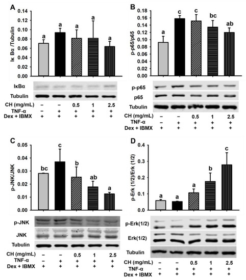 CH improved the adipocyte inflammation induced by TNF-α via the mediation of NF-κB p65 and MAPK signal pathway. 3T3-L1 cells were seeded in 6-well plates, and preincubated in differentiation medium containing 0.5, 1 and 2.5 mg/mL CH for 1 h, respectively. Then 10 ng/mL TNF-α was added and incubated for 24 h. Then, new differentiation medium containing the corresponding CH was replaced and cultured for another 48 h and 72 h. Western blot was used to detect the expression levels of IκBα (A), p-p65 (B), p-JNK (C), and p-Erk 1/2 (D). Different superscript letters meant a statistically significant difference at p < 0.05.