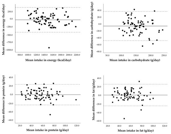 Furthermore, according to the Bland–Altman Spearman correlation coefficients (Table 1), we found good outcomes (p > 0.50) for energy, macronutrients, dietary fiber, and most micronutrients. However, the outcomes for iron (p = 0.031), vitamin E (p = 0.006), and vitamin C (p = 0.042) intakes were considered to be poor and thus reflected proportional bias.