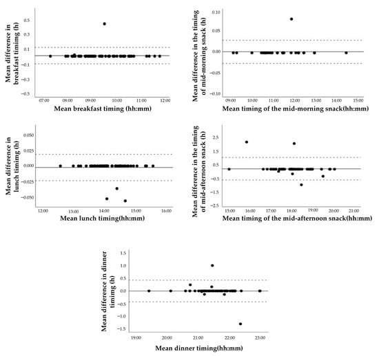 Finally, our results showed that the reliability of the test method to evaluate the timing of most meals was excellent. Only in the case of the timing of the mid-afternoon snack and dinner was the reliability good to excellent (Table 4).