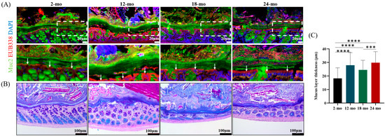 pH is one of the influencing factors in the formation and release of mucus [32,33]. The changes in mucus pH with increasing age were shown in Figure 3A. Compared with 2 months of age, pH did not change significantly at 12 months of age while decreased significantly at 18 and 24 months of age. Changes in mucus pH indicate that mucus secretion and stratification may also be altered.