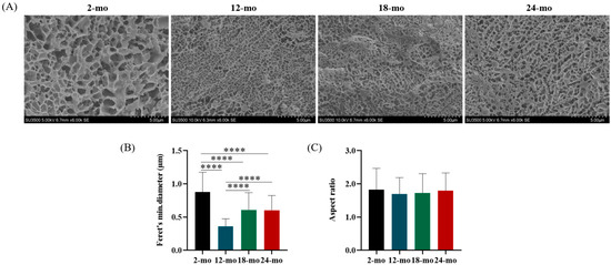 The disulfide bonds between non-glycosylated region and multiple non-covalent bonds form a highly entangled mucus gel network. These networks are important structural components in the mucus layer that can interact with microbes and protect intestinal epithelial cells. The Cryo-SEM results of different ages were displayed in Figure 2A–C. Results showed that there were extended gel networks in the colonic mucus samples of all mice, and the size of the pores of these gel networks was statistically different in different age groups (Figure 2A,B). However, the shape of the pores did not change significantly (Figure 2C). Cryo-SEM images of the mucus at 2 months of age showed relatively large pores, while the colonic mucus network at 12, 18, and 24 months of age contained smaller pores. Compared with 2-month-old mice, the mini-mum diameter of the colonic mucus network was significantly reduced in 12-month-old, 18-month-old, and 24-month-old mice, especially at 12 months old. This suggests that the pore size of the mucus microscopic network changes during aging, but the network shape does not.