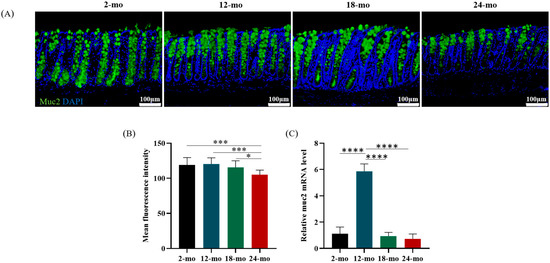 The gel-forming mucin Muc2 is a major structural and functional component of the mucus barrier [34]. Immunofluorescence staining of colon sections at different months of age was performed, and Muc2 gene expression in the colon was quantified. Compared with mice at 2 months of age, Muc2 protein content in the colon decreased significantly in mice at 24 months of age (Figure 4A,B). Interestingly, this decrease occurred mainly in the crypt base, which may have an impact on the activity of stem cells. Similarly, the Muc2 mRNA level reduced in 24-month-old mice compared with 2-month-old mice (Figure 4C).