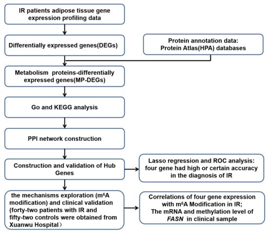 First, the RNA-seq dataset GSE174475 from the Gene Expression Omnibus (GEO) database was used to identify differentially expressed genes (DEGs) between patients with IR and matched healthy individuals (controls). Second, DEGs coding for metabolism-related proteins (MP-DEGs) were selected. Functional and pathway enrichment analyses of the MP-DEGs were then carried out using the Gene Ontology (GO) and Kyoto Encyclopedia of Genes and Genomes (KEGG) databases. Third, a protein–protein interaction (PPI) network of the MP-DEGs was constructed and used to select functional modules and hub genes. Subsequently, 10 hub genes were selected for further analysis. Key hub genes were further identified using the least absolute shrinkage and selection operator (LASSO) regression analysis method, and their clinical value for the diagnosis of IR was evaluated using receiver operating characteristic (ROC) curves. Furthermore, the relationships between candidate gene expression and m6A modification were explored. Finally, adipose tissues from patients with IR and healthy individuals were collected to validate their expression of the key MP-DEGs and their correlation with m6A modification. A flowchart of this study is shown in Figure 1.