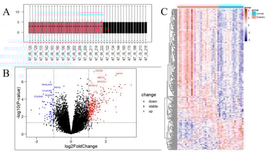 Analysis of the gene expression correlation and differential gene expression between the insulin resistance (IR) and control groups in the dataset. (A) Box plot of the gene probe expression levels among the samples. There was no significant difference in the median or upper and lower quartiles. (B) Volcano map of all differentially expressed genes (DEGs) in the IR and control groups analyzed with the limma R package; p < 0.05 and |log2 fold change| ≥ 1. The top 10 upregulated and downregulated genes with the smallest p-values are marked on the map. (C) Heatmap of all DEGs in the IR and control groups.