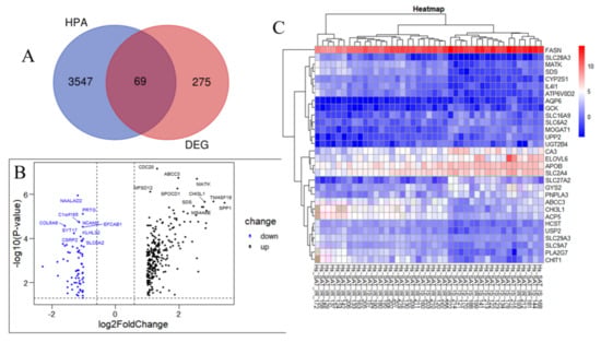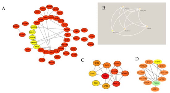 The STRING database was used to create a PPI network from the 69 MP−DEGs, following which the network was used to explore the interactions between the metabolism-related proteins. Cytoscape was used to visualize the entire PPI network (Figure 7A). The PPI network comprised 72 edges and 69 nodes. The MCODE plug-in in Cytoscape was used to create the functional modules. The findings revealed that only one module, comprising 9 genes and 34 edges, had an established score of greater than 5 (Figure 7B). The top 10 hub genes were screened using the 10 topological approaches of the CytoHubba plug-in in Cytoscape. Ten genes were identified using all ten methods, namely, FASN, GCK, FGR, FBP1, GYS2, PNPLA3, MOGAT1, SLC27A2, PNPLA3, and ELOVL6 (Figure 7C and Supplementary File S4). FASN was selected as the key gene because it had the highest MCC score. The first node gene that interacted with FASN was determined using CytoHubba. Of the 10 genes screened, 1 was upregulated and 9 were downregulated (Figure 7D).
