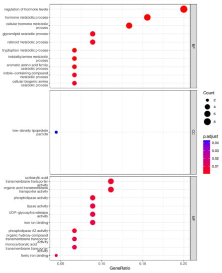 Gene ontology (GO) enrichment analysis of the differentially expressed genes of metabolism-related proteins (MP-DEGs). The dot plots show the top 10 processes enriched in the MP−DEGs in the Biological Process (BP), Cellular Compartment (CC), and Molecular Function (MF) categories.