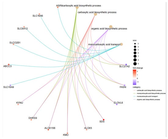Circle graph from the gene ontology (GO) enrichment analysis of the differentially expressed genes of metabolism-related proteins (MP−DEGs).