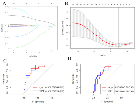 Construction and validation of the hub genes. (A) Plots of LASSO regression coefficients versus different values of the penalty parameter. (B) Cross−validation plot for the penalty term. (C) ROC curves for FGR and FBP1 (AUC: 0.83 and 0.86, respectively); p < 0.05. (D) ROC curves for FASN and GCK (AUC: 0.78 and 0.80, respectively); p < 0.05.