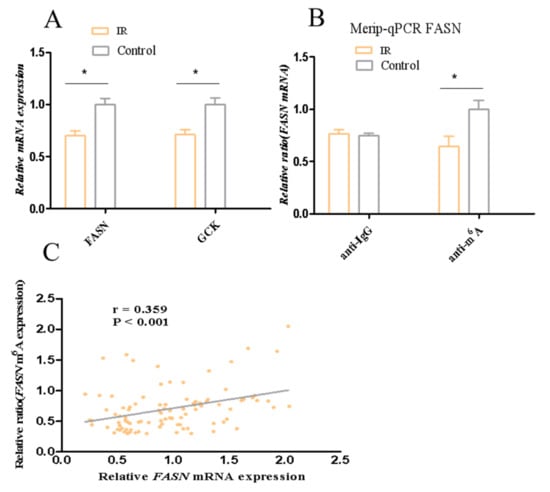 Based on the results on the ability of the FASN to predict IR as a biomarker and the correlation with m6A modification, meRIP-qPCR was conducted to assess FASN methylation levels in clinical samples. The results showed that the methylation levels of FASN in adipose tissue of patients with IR were decreased (Figure 9B, p < 0.05). Additionally, we found FASN mRNA expression was positively correlated with the methylation levels of FASN (r = 0.359, p = 0.001) in all participants (Figure 9C). These data suggested that the downregulation of FASN may be caused by the decrease in the methylation of FASN in IR.