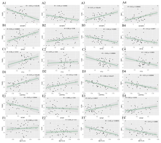Correlations between FGR, FBP1, FASN, and GCK expression and m6A modification. The relationships of FGR, FBP1, FASN, and GCK expression with IGF2BP3 (A1–A4), EIF3A (B1–B4), FTO (C1–C4), LRPPRC (D1–D4), WTAP (E1–E4), and METTL14 (F1–F4) expression are shown.