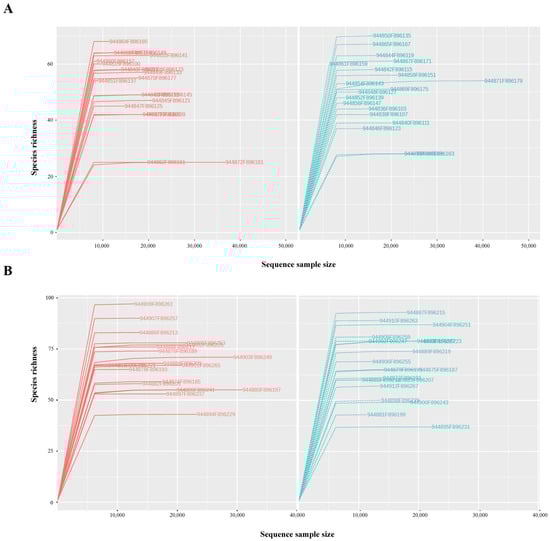 Rarefaction curves before (red) and after (blue) low-calorie (A) and two-phase (B) diet. Every curve corresponds to a single sample.