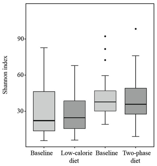 Alpha diversity, which reflects the species diversity of the community, was assessed using the Shannon index. Although the index of the low-calorie diet group was higher and that of the two-phase diet group was lower than that of the baseline groups (Figure 2), the differences were not statistically significant (p = 0.83 and p = 0.55, respectively).