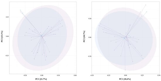 Principal Coordinate Analysis of Bray–Curtis distance for beta-diversity evaluation between baseline (blue samples) and low-calorie (on the left) and two-phase (on the right) diets (violet sample). PC1 and PC2 represent the top two principal coordinates that captured most of the diversity.