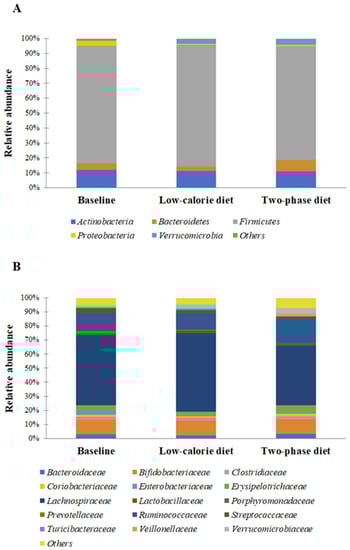 Structure of the gut microbiota at baseline and after low-calorie and two-phase diets. Relative abundance of Phyla (A) and Families (B) is reported.