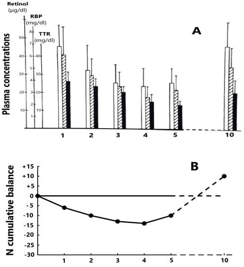 Former studies have appraised the trajectory of the RCC edifice in patients enduring an acute episode of a surgical or inflammatory disorder. Such stressful circumstances are marked by cytokine-induced abrogation of TTR synthesis dragging down the two other RCC components and maintaining unaltered relationships [] (Figure 1A). Cytokines also generate LBM proteolysis in the whole body leading to increased urinary losses of nitrogenous catabolites with a N balance turning negative to reach a nadir level by day four or five (Figure 1B) and are hence associated with disclosure by the RCC triad []. The dietary rehabilitation of PCM children initiates the gradual restoration of TTR–RBP–retinol values toward normal levels, keeping unmodified RCC relationships [] (Table 2). The depletion RCC curve is primarily determined by the surge of cytokines suppressing the production of liver TTR [,], whereas the refeeding RCC curve is principally stimulated by de novo synthesis of TTR releasing holoRBP molecules [,]. As a result, the transient decrease of RCC values in both inflammatory and nutritional disorders appears to be unrelated to the liver retinoid stores. It is nevertheless worth noting that the stoichiometric relationships between the three RCC molecules are more stable in refeeding studies (Table 2) than in depleting processes (Figure 1A) owing to the more versatile behavior of RBP during inflammatory conditions.