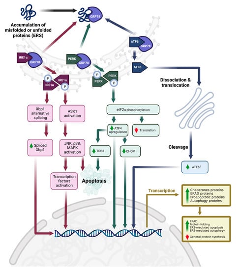The endoplasmic reticulum (ER) is one of the essential intracellular organelles. It can be divided into rough and smooth ER, depending on the presence of ribosomes on the outer surface. Rough ER synthesizes proteins and subjects them to folding and post-translational modification []. Protein folding is essential for converting a polypeptide chain into a fully functional protein in a tertiary or three-dimensional structure []. Several factors, including extreme temperature, extreme pH, exogenous chemicals or denaturants, hypoxia, nutrient deprivation, viral infection, mechanical forces, aberrant calcium ion homeostasis, oxidative damage, or protein mutation, can cause interruption (unfolding) and/or errors in protein folding (misfolding) [,]. The accumulation of these unfolded or misfolded proteins in the ER lumen is known as ER stress (ERS), which triggers the unfolded protein response (UPR) to restore ER homeostasis and folding capacity [,].