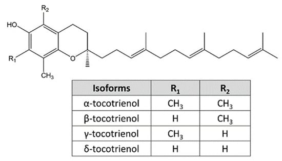 Bioactive compounds from natural resources possess great potential in novel drug design and development. Tocotrienol and tocopherol are two natural vitamin E families. Structurally, tocopherol and tocotrienol consist of a chromanol ring and a carbon tail. The distinction is that tocopherol has a saturated hydrocarbon phytyl tail and tocotrienol has an unsaturated farnesyl tail with three carbon-carbon double bonds [,,]. Tocopherol and tocotrienol can be further classified into 4 isoforms, namely α-, β-, γ-, and δ-tocotrienol, due to the variation in the position of side chains on the chromanol ring (Figure 2) [,]. Tocotrienols are found naturally in vegetable oils, including palm oil, rice bran oil, barley oil, and annatto seed oil, and in trace amounts in sunflower seed, grapefruit seed, nuts, vegetables, and fruits [,,].