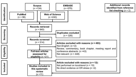 A total of 840 records (96 articles from PubMed, 134 articles from Scopus, 240 articles from the Web of Science, and 370 articles from the EMBASE database) were identified. After removing the duplicates, 514 articles were screened for titles and abstracts. A total of 493 articles were excluded due to language (n = 2), lack of primary data (n = 43), and being irrelevant to the topic (n = 448). After assessing the eligibility of the full-text articles, 12 articles were excluded because 10 were not studying tocotrienol and 2 were using combination treatment, and the effects of tocotrienol treatment could not be determined. Two additional articles were included, and a final 11 articles were included for qualitative analysis in this systematic review.