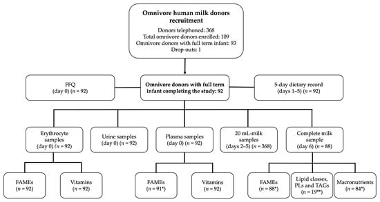 Flow chart for omnivore human milk donors’ recruitment and sampling. * The difference between 92 and the number of samples reflects missing data. ** Corresponding to a randomly selected subgroup of 19 omnivore donors with full-term infants. Abbreviations: FFQ, food frequency questionnaire; FAMEs, fatty acid methyl esters; PLs, relative composition of phospholipids; TAGs, molecular species of triacylglycerols.