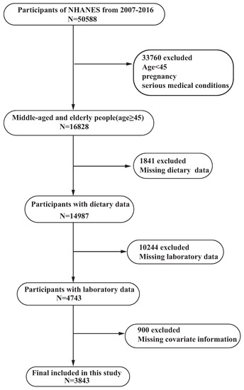 The study sample was selected based on the following criteria: inclusion criteria included all samples aged ≥45 years in the NHANES database from 2007–2016, while exclusion criteria were (1) pregnant women, (2) participants with serious diseases (e.g., malignancy, coronary heart disease, etc.), and (3) participants with missing data on key indicators such as demographic, laboratory and questionnaire data, and dietary data. A total of 3843 study subjects were included after applying these criteria. (Figure 1 and supplementary file).