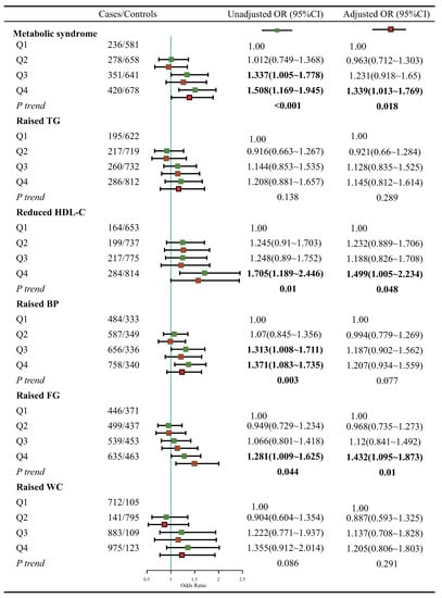 Association of DII with MetS and its components. Adjusted for confounding factors such as age, gender, race, education, poverty–income ratio, smoking, alcohol consumption, and sedentary behavior.