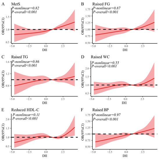 The restricted cubic spline for the associations of DII with MetS and its components. (A) Metabolic syndrome; (B) Raised FG; (C) Raused TG; (D) Raised WC; (E) Reduced HDL-C; (F) Raised BP. Knots were placed at the 5th, 35th, 65th, and 95th percentiles of the DII distribution. Results were adjusted for age, gender, race, education, poverty–income ratio, smoking, alcohol consumption, and sedentary behavior.