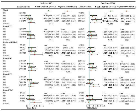 Subgroup analysis of association between DII and MetS as a whole and its components among different gender groups. Adjusted for confounding factors such as age, gender, race, education, poverty–income ratio, smoking, alcohol consumption, and sedentary behavior. Q1 [−5.21, −1.33), Q2 [−1.33, 0.10), Q3 [0.10, 1.52), Q4 [1.52, 4.43) for male; Q1 [−4.71, −0.54), Q2 [−0.54, 1.10), Q3 [1.10, 2.37), Q4 [2.37, 4.66) for female.