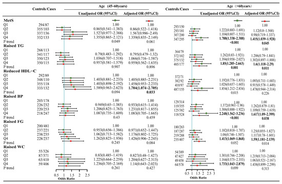 Subgroup analysis of association between DII and MetS as a whole and its components among different age groups. Adjusted for confounding factors such as age, gender, race, education, poverty–income ratio, smoking, alcohol consumption, and sedentary behavior. Q1 [−5.21, −1.10), Q2 [−1.10, 0.60), Q3 [0.60, 2.09), Q4 [2.09, 4.23) for the age range of 45 to 60 years; Q1 [−4.71, −0.89), Q2 [−0.89, 0.66), Q3 [0.66, 1.99), Q4 [1.99, 4.66) for age over 60 years.