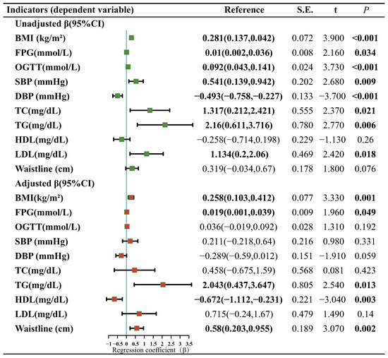 Generalized linear regression analysis of DII levels and indicators of MetS. BMI, body mass index; SBP, systolic blood pressure; DBP, diastolic blood pressure; HDL-C, high-density lipoprotein cholesterol; LDL-C, low-density lipoprotein cholesterol; TC, total cholesterol; TG, total triglycerides; FPG, fasting blood sugar; OGTT, oral glucose tolerance test. Adjusted for confounding factors such as age, gender, race, education, poverty–income ratio, smoking, alcohol consumption, and sedentary behavior. Green: No adjustments were made; Red: Adjusted for confounding factors.
