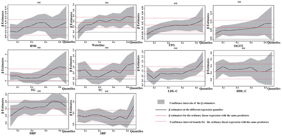 Quantile regression estimation coefficient plot of DII level versus biochemical index of MetS. Adjusted for confounding factors such as age, gender, race, education, poverty–income ratio, smoking, alcohol consumption, and sedentary behavior.
