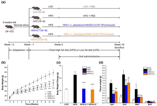 Animal experiments were performed in accordance with protocols approved by the Committee on the Ethics of Animal Experiments of the Handong Global University (Permit number: 20221026-12). Five-week-old C57BL/6 male mice from Saeronbio Inc. (Uiwang-si, Gyeonggi-do, Republic of Korea) were housed at 23 ± 1 °C and 60 ± 5% humidity, on a 12 h light/dark cycle. After 1 week of adaptation, the mice were divided into 8 groups. (N = 7 per group). Table 1 provides a detailed description of the groups. Before the oral administration of bacteria or G. cambogia extract, LFD (10% kcal from fat, D12450J, Research Diets Inc., New Brunswick, NJ, USA) or HFD (60% kcal from fat, D12492, Research Diets Inc., New Brunswick, NJ, USA) was given for a week to induce dysbiosis. The diet was changed to a high-fat diet or a low-fat diet 1 week before the probiotics treatment was conducted, since starting to take a high-fat diet and probiotics treatment at the same time may not have a significant effect [38]. Animal experiments were conducted for two purposes. In the first experiment, to verify the anti-obesity effect of L. plantarum HAC03, 200 µL PBS or 1 × 109 CFU/mouse of probiotics (L. plantarum 299V or L. plantarum HAC03) were orally administered once a day for 10 weeks, depending on the group. In the second experiment, in order to verify the synergistic effect of L. plantarum HAC03 and G. cambogia extract, 1 × 108 CFU/mouse of L. plantarum HAC03 and 200 mg/kg of G. cambogia extract containing 65% HCA was orally administered alone or in combination for 11 weeks. On the last day of the experiment, the mice were sacrificed by CO2 gas. The organs (liver, spleen, small intestine, colon, subcutaneous adipose tissue (SAT), epididymal adipose tissue (EAT), mesenteric adipose tissue (MAT) and brown adipose tissue (BAT)) were collected and stored at −80 °C until used.