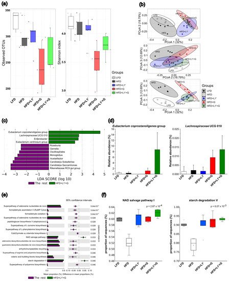 Globally, a number of studies have revealed that obesity is closely related to the imbalance of gut microbiota [57]. The imbalance of gut microbiota can be both the cause and result of obesity, and probiotics can alleviate obesity by restoring the imbalance [58]. To evaluate the effects of complex L. plantarum HAC03 and G. cambogia on gut microbiota, a gut microbiome analysis was conducted based on the 16S rRNA gene. We found that gut microbiota composition varies depending on the orally administered substance. Alpha diversity is represented by showing the number of species in a particular ecosystem [59]. A comparison of alpha diversity values between obese and normal people revealed that the alpha diversity values of obese patients were lower than those of normal people [60]. Consistent with previous studies, we observed that the alpha diversity of the HFD group was lower than the LFD group (Figure 5a). In the HFD + L1′ group, the number and evenness of gut microbiota increased compared with the HFD group. On the other hand, in the HFD + G group, the number and evenness of gut microbiota decreased, and the variation between samples increased significantly. G. cambogia has been reported to have antimicrobial effects on both gram-positive and gram-negative bacteria [61]. Due to its broad-spectrum antimicrobial properties, G. cambogia may have a negative impact on gut microbiota itself, despite its positive effects on weight loss.